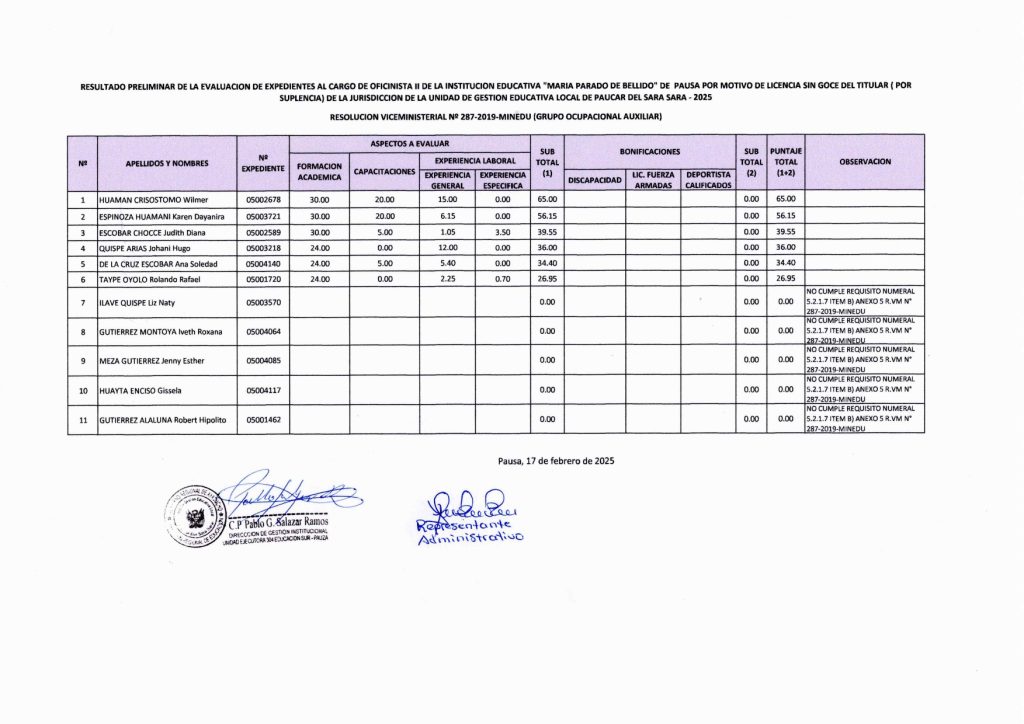 Resultados preliminaresde evaluación de expedientes para el cargo de Oficinista para la I.E. «Maria Parado de Bellildo»