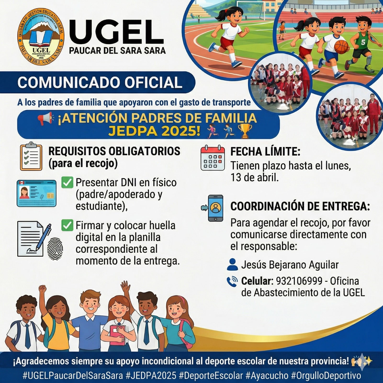 La Unidad de Gestión Educativa Local Paucar del Sara Sara informa a los padres de familia y apoderados de los estudiantes que representaron a la UGEL en la Etapa Regional de los Juegos Escolares Deportivos y Paradeportivos (JEDPA) 2025, desarrollada en la ciudad de Huamanga, que, gracias a las gestiones realizadas ante el Gobierno Regional de Ayacucho, se ha dispuesto la devolución de los gastos de transporte asumidos por las familias.