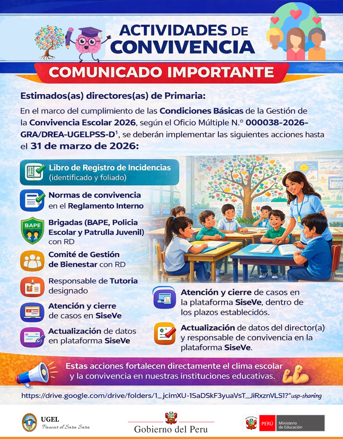Con el objetivo de promover entornos seguros, respetuosos y favorables para el aprendizaje, la UGEL viene impulsando el cumplimiento de las Condiciones Básicas de la Gestión de la Convivencia Escolar 2026 en todas las instituciones educativas de su jurisdicción.