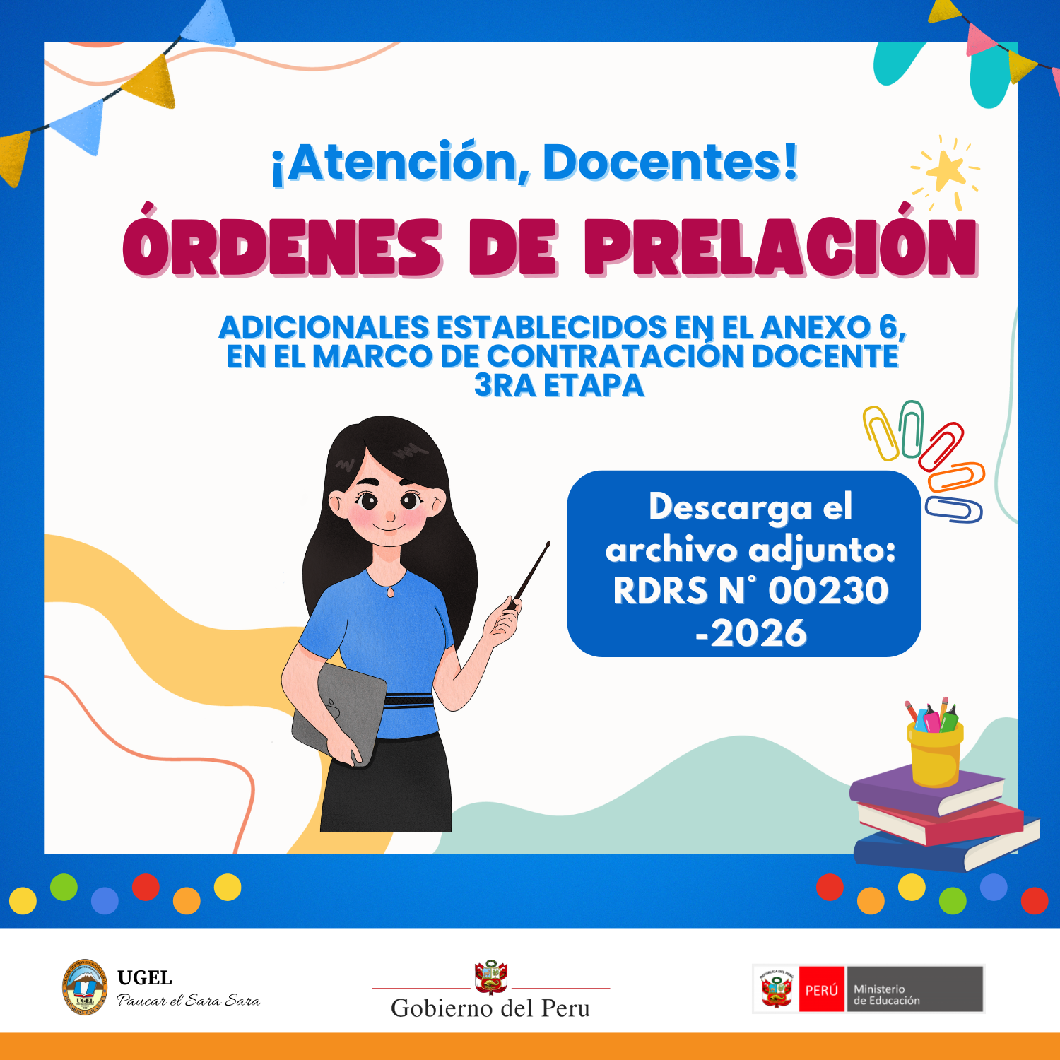 La Unidad de Gestión Educativa Local Páucar del Sara Sara informa a los docentes postulantes que, en el marco del proceso de Contratación Docente 2026 – Tercera Etapa, se han establecido Órdenes de Prelación adicionales, conforme a lo dispuesto en el Anexo 6.